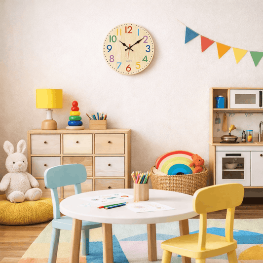 Houten wandklok met kleurrijke cijfers voor kinderkamer